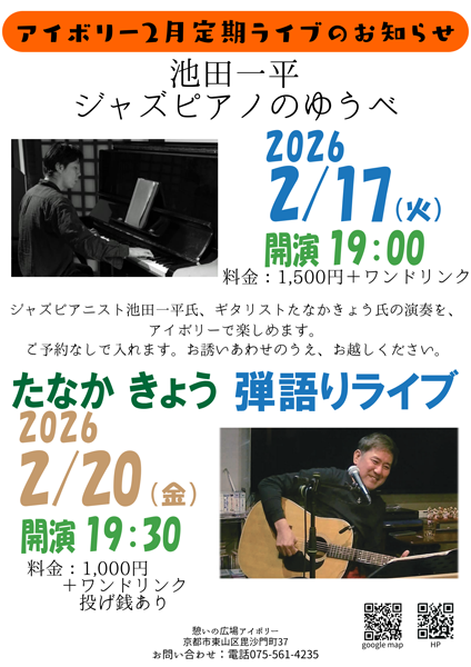 ジャズ・ピアニスト池田一平氏、ギタリストたなかきょう氏の演奏をアイボリーでお楽しみください。