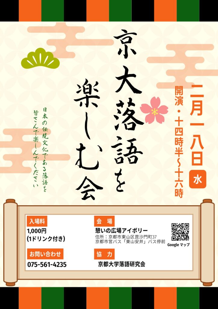日本の伝統文化である落語の公演が東山安井の「憩いの広場 アイボリー」で開催されます。