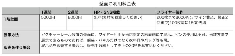 展示方法はピクチャーレール設置の壁面に、ワイヤー利用か当店指定の粘着剤にての展示になります。